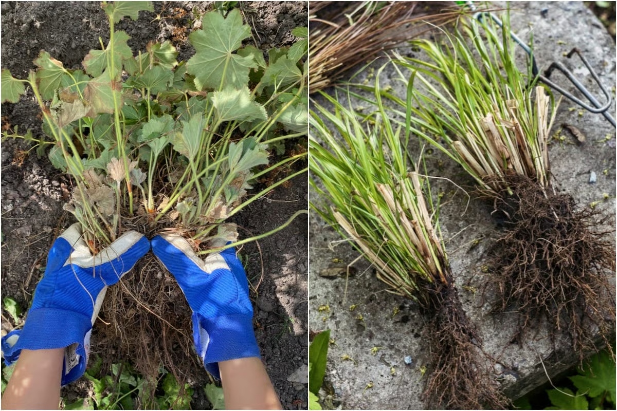 For spreading root systems like asters you can often pull sections apart by hand. Clumping plants like hostas and daylilies may need a sharp knife through the crown.